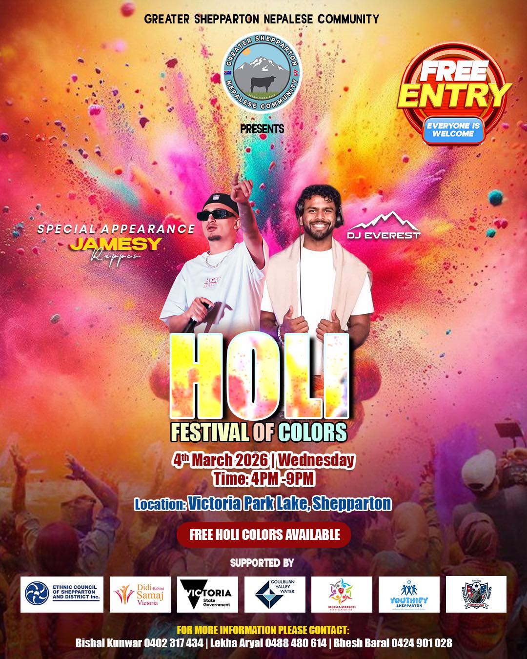 Shepparton Holi Festival of Color is just around the corner on 4 March. Get ready to witness JAMESY performing live along with DJ Everest. Enjoy cultural performances, delicious food, color fun, music, and joyful celebrations with family and friends. See you there. Free Event.