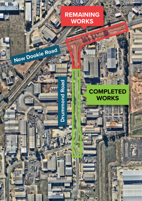 Council advises that works at the intersection of Drummond Road and New Dookie Road involve construction of pits and pipes within the traffic island and the left hand turn lane into Drummond Road from New Dookie Road. As a result, altered traffic management arrangements must be put in place for the duration of these works.